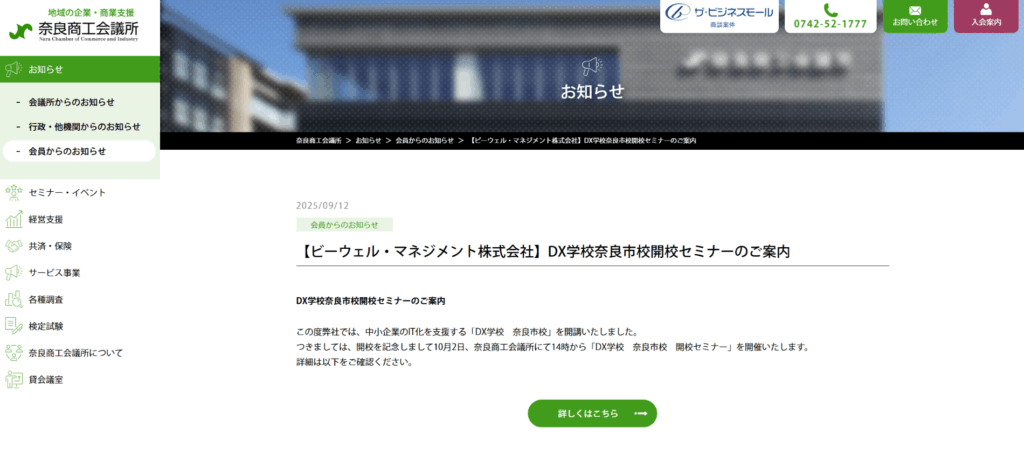 お知らせ 奈良商工会議所のお知らせに掲載頂きました Tweet 2025.09.16 by DX学校奈良市校 奈良商工会議所の「会員からのお知らせ」にDX学校奈良市校の開校セミナーをご紹介頂きました。https://www.nara-cci.or.jp/member/579/