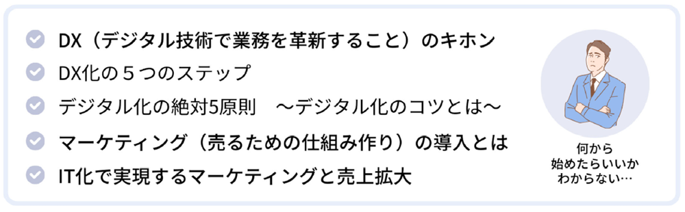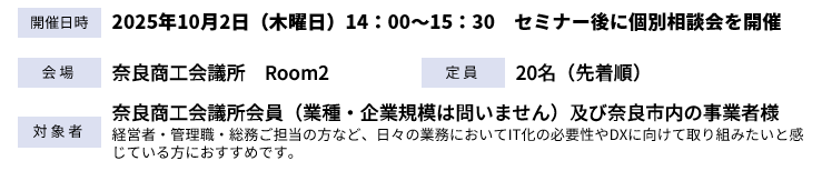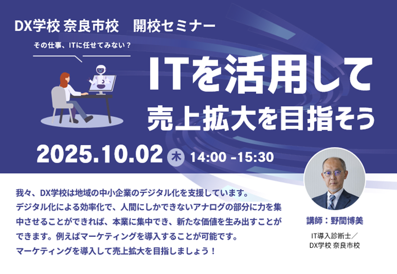 セミナー DX学校 奈良市校 開校セミナー(参加無料) Tweet 2025.09.10 by DX学校奈良市校 DX学校 奈良市校では、開校セミナー(参加無料)を開催いたします。 詳細は以下の通りです。 当セミナーは主として、ITの導入をどのように進めれば良いのかお悩みの経営者を対象に、ITの導入方法からITを導入することで売上拡大を図るまでの道筋をお話いたします。 お申し込みは一番下のセミナー申し込みのボタンをクリックして、必要情報をご記入ください。 皆様のご参加をお待ちしております。 セミナーチラシ閲覧 このセミナーでわかること 開催概要